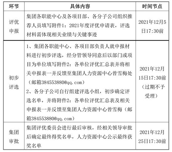 為弘揚公司企業(yè)文化,認(rèn)真落實公司"勤勉誠信、務(wù)實創(chuàng) 新、精益高效、共存共贏"的價值觀,表彰為集團發(fā)展做出杰出 貢獻的優(yōu)秀團體與個人,激發(fā)員工榮譽感與向上的動力,表彰先進,樹立榜樣,集團決定開展 2021 年度評優(yōu)工作,現(xiàn)將有關(guān)事項通知如下: