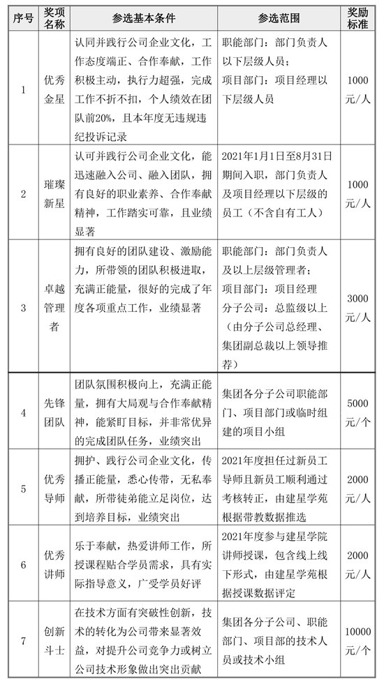 備注:獎項 1、3 的參選人員需是 2021 年 1 月 1 日之前入職且連續(xù)工作滿 1 年的員工。