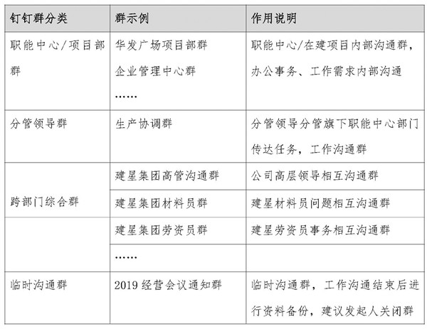 請公司各位負(fù)責(zé)人及同事于 2019 年 2 月 28 日前,關(guān)閉相關(guān)的 QQ 和微信工作群,在釘釘建立工作溝通群,逾期未進(jìn)行該項工作的人員將予以警告。原則上只允許存在一個中心職能部門群或項目部管理群;建立跨部門臨時群時,需按照誰主導(dǎo)誰發(fā)起的原則進(jìn)行建立臨時溝通群,事務(wù)溝通結(jié)束后,建議將相關(guān)文件資料進(jìn)行備份后解散關(guān)閉釘釘群;若是建立跨部門永久綜合溝通群,則以主管領(lǐng)導(dǎo)的身份進(jìn)行建立釘釘群,并制定好群規(guī),保證工作的有效溝通和效率。