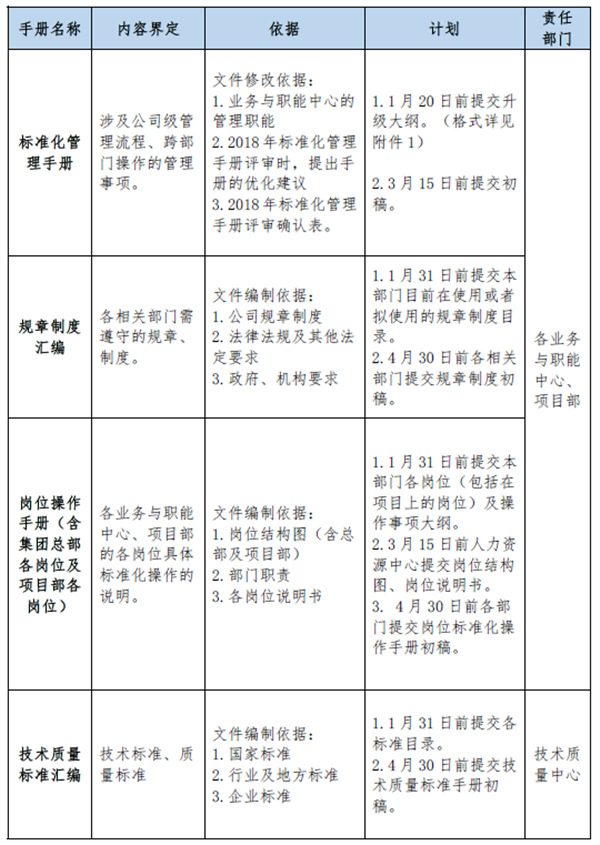 1. 標(biāo)準(zhǔn)化管理手冊編制大綱是以手冊管理事項為單位,各 部門依據(jù)管理職能、評審時的優(yōu)化建議以及所簽署的《2018 年標(biāo)準(zhǔn)化管理手冊評審確認(rèn)表》中相關(guān)整改措施,按附件 1