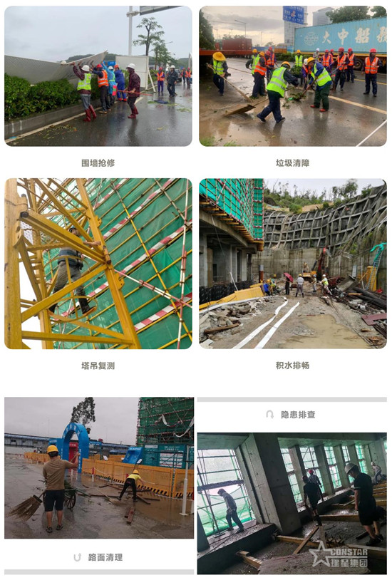 臺風過境后。各項目受到不同程度的破壞,公司迅速組織災后復產(chǎn)工作部署,對受損圍墻、安全網(wǎng)、電箱、辦公及生活板房等進行維修;對垂直人貨梯、塔吊等復測,以保證安全使用;對低洼積水排暢、路面垃圾清障、衛(wèi)生死角消殺。僅用半天時間,各項目部便恢復復工條件。