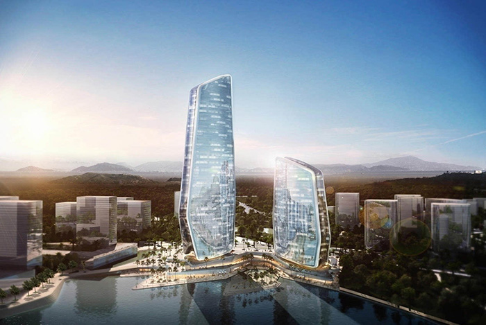 項目位于金灣西湖片區(qū)啟動區(qū),山湖海路南側(cè),金鑫路西側(cè)。總建筑面積約171736.28平方米,呈“雙子塔”建筑群。其中,1#塔樓建筑高度約186米,共41層,建筑面積約8萬平米;2#塔樓150米,共39層,建筑面積約2.8萬平米。塔樓規(guī)劃功能包括國際標(biāo)準(zhǔn)甲級寫字樓、五星級酒店、商業(yè)配套設(shè)施等。