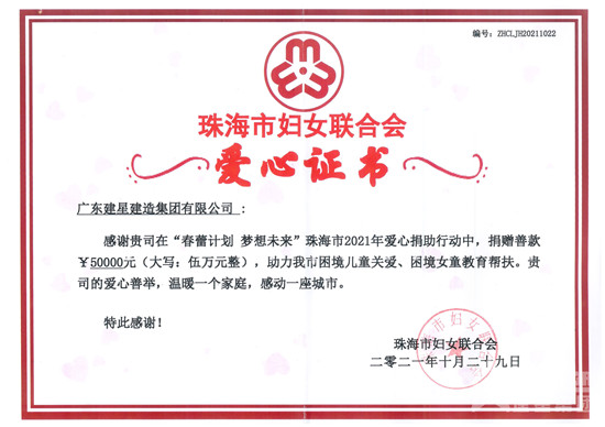 涓涓細(xì)流匯江海,點(diǎn)點(diǎn)真情綻春蕾。建星集團(tuán)積極響應(yīng)市婦聯(lián)號(hào)召,參與“春蕾計(jì)劃——夢(mèng)想未來(lái)”行動(dòng),通過(guò)廣東省天行健慈善基金會(huì)捐贈(zèng)善款五萬(wàn)元,助力慈善項(xiàng)目開展。扶一株春蕾,爭(zhēng)一份春光;助一名學(xué)童,贏一片希望。讓更多春蕾兒童受到良好教育,實(shí)現(xiàn)人生夢(mèng)想,讓愛托舉起孩子們更加美好的未來(lái)!