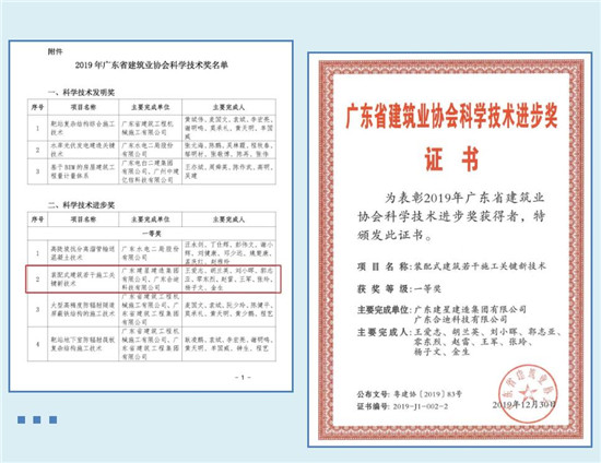 近日,廣東省建筑業(yè)協(xié)會(huì)頒發(fā)了“2019年廣東省建筑業(yè)協(xié)會(huì)科學(xué)技術(shù)獎(jiǎng)”證書,建星集團(tuán)完成的“裝配式建筑若干施工關(guān)鍵新技術(shù)”成果,榮獲科學(xué)技術(shù)進(jìn)步獎(jiǎng)一等獎(jiǎng)。