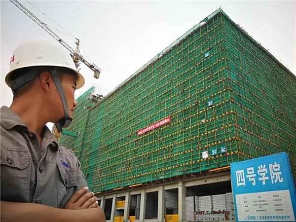 珠海的天氣高溫多雨,潮濕漫長。從四季分明的城市來到這里,起初我特別不適應(yīng)。每天的戶外一線施工作業(yè)對我而言如同蒸了整整一天的桑拿,毒辣的太陽、汗?jié)竦墓ひ掠绕渥屓四臒┰?。然而高空作業(yè)注意力必須高度集中,容不得一點(diǎn)馬虎和疏漏。當(dāng)時(shí)心里就一個(gè)想法,無論遇到什么困難,必須堅(jiān)持下去,為項(xiàng)目高質(zhì)量完成保駕護(hù)航。整個(gè)漫長的夏天從開始的咬牙堅(jiān)持到逐漸的適應(yīng),四號學(xué)院就像一個(gè)我親手養(yǎng)育的孩子慢慢長大成人。