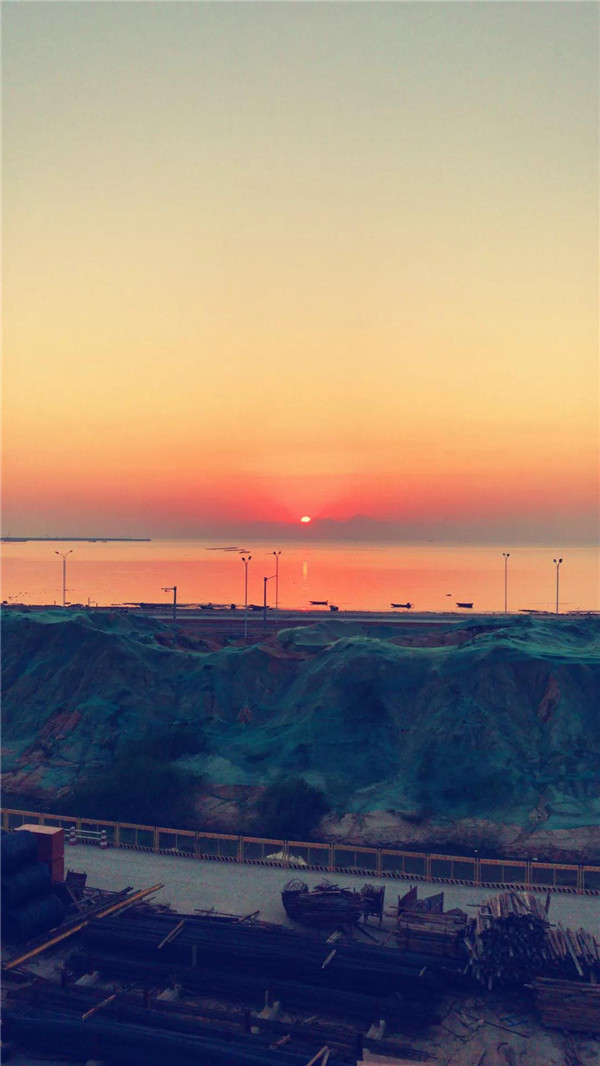 某次值班,天氣依然很熱,干完活已近黎明。身后高樓大廈,腳下鋼筋水泥,抬眼望去一輪火紅的太陽從海平面冉冉升起,真的好美。如果是有藝術(shù)細(xì)胞的人,可能會寫首詩,我完全沒有。只是感覺很幸福,并用手機(jī)記錄下了這份美好。