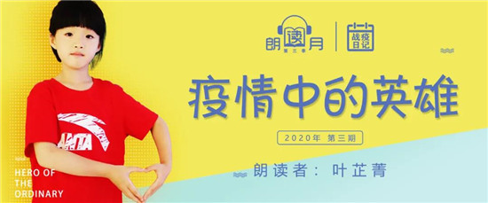 傾聽“星”聲,記錄美好。建星【朗讀月】第三季——我的戰(zhàn)疫日記,讓我們跟隨朗讀者的文字和聲音一起記錄這段特殊時(shí)期的感動(dòng)點(diǎn)滴,用愛傳遞抗“疫”力量。歡迎收聽【朗讀月】第三季第三期《疫情中的英雄》,朗讀者:葉芷菁 。